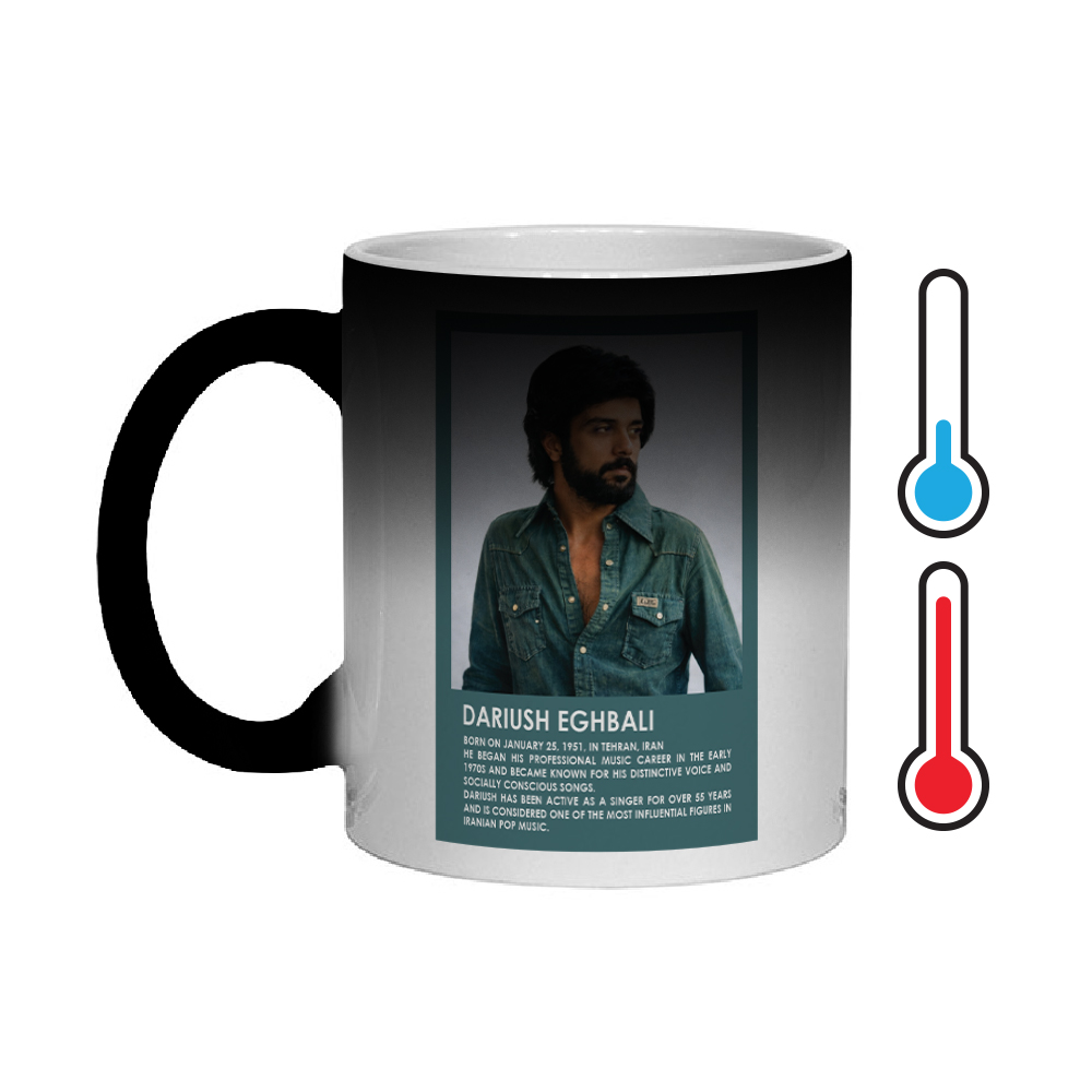 طرح "بیوگرافی داریوش اقبالی" با سبکی مدرن و مینیمال طراحی شده است. در قسمت بالایی، پرترهای با استایل کلاسیک از هنرمند در کادری مستطیلی قرار گرفته و در پایین آن، اطلاعات کلیدی شامل تاریخ تولد، محل تولد و خلاصهای از مسیر حرفهای و تاثیرگذاری او در موسیقی پاپ ایران به زبان انگلیسی درج شده است. رنگ زمینه سبز تیره (Petrol Green) در کادر متنی، تضاد زیبایی با بدنه سفید ایجاد کرده و ظاهری شبیه به پوسترهای گالریهای هنری به محصول بخشیده است. این چیدمان برای افرادی که به دنبال اکسسوریهای خاص و آموزشی هستند، بسیار جذاب است.
