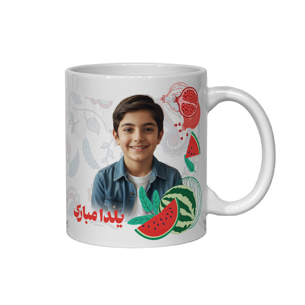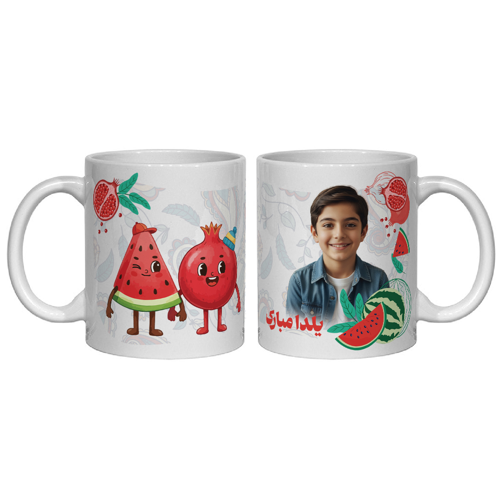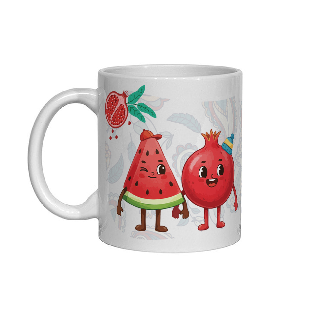 - طرح این ماگ، نمادی شاد و کودکانه از شب یلدا است. انار و هندوانه با چهرههای فانتزی و دوستانه، حس شادی و نشاط را منتقل میکنند. ترکیب این شخصیتهای کارتونی جذاب با تصویر شخصی شما، یک طراحی خاص و منحصر به فرد ایجاد میکند که برای یادگاریهای خانوادگی و هدیه به فرزندان بسیار مناسب است. زمینه طرح با نقوش اسلیمی کمرنگ، حس اصالت و زیبایی ایرانی را به سادگی ماگ میافزاید.