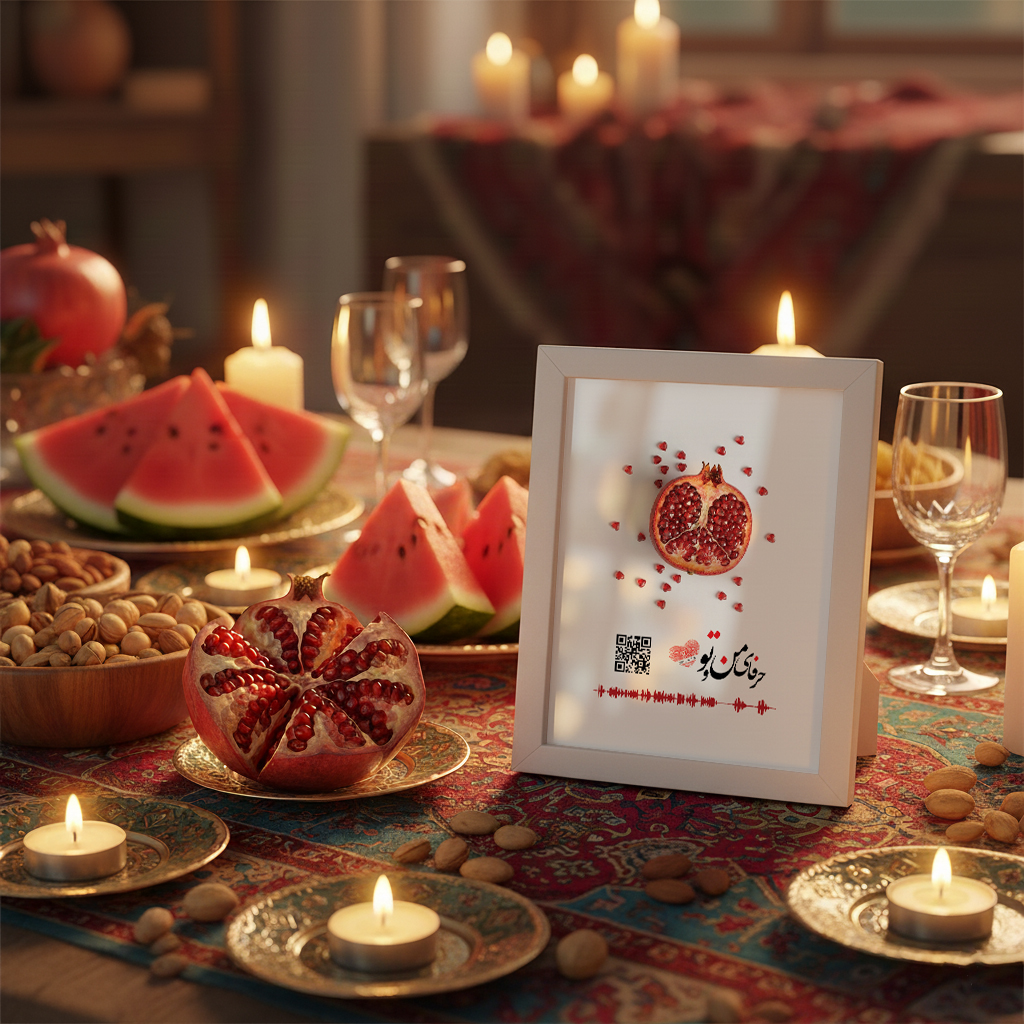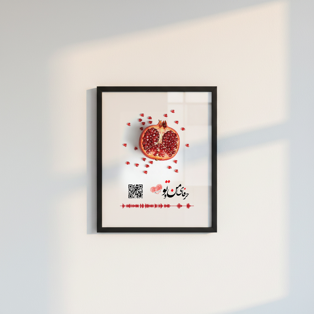 طرح این قاب، الهام گرفته از انار به عنوان نماد اصلی شب یلدا است که در فرهنگ ما مظهر برکت و عشق محسوب میشود. ترکیب رنگهای قرمز و سفید در یک بستر مینیمال، حس اصالت و سادگی را القا میکند. ایده اصلی، ادغام یک عنصر سنتی (انار) با یک عنصر مدرن (کد QR صوتی) است تا یک اثر هنری تعاملی خلق شود.پیشنهاد طرحهای مرتبط: قابهای مناسبتی دیگر با کد موزیکال برای ولنتاین، تولد، سالگرد ازدواج، یا طرحهایی با نمادهای سنتی مانند حافظ یا سفره هفتسین.