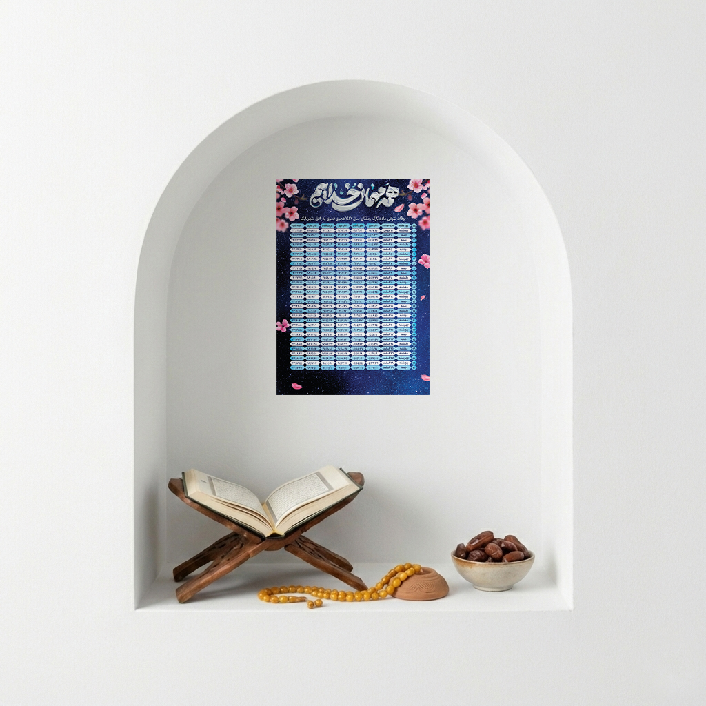 ایده اصلی این طرحها بر پایه پیوند "طبیعت" و "معنویت" شکل گرفته است. در طرح روشن، کالیگرافی دایرهای در میان شکوفهها، نمادی از چرخش ایام و رسیدن به بهار قرآن است که برای محیطهای مدرن و مینیمال بسیار چشمنواز است. در مقابل، طرح "مهمان خدا" با کتیبهای درخشان بر فراز آسمان شب، عمق و سکونِ نیایشهای سحرگاهی را تداعی میکند. این تنوع بصری به شما اجازه میدهد تا بر اساس هویت سازمان یا سلیقه شخصی، طرحی را انتخاب کنید که بیشترین هماهنگی را با دکوراسیون یا پیام برند شما داشته باشد. هر دو سبک فضای کافی برای شخصیسازیهای تبلیغاتی را در اختیار شما قرار میدهند.
