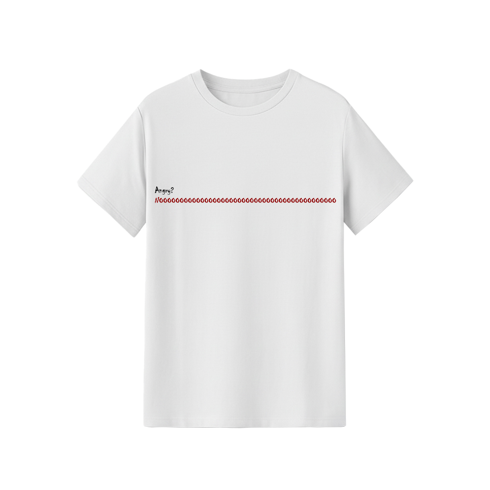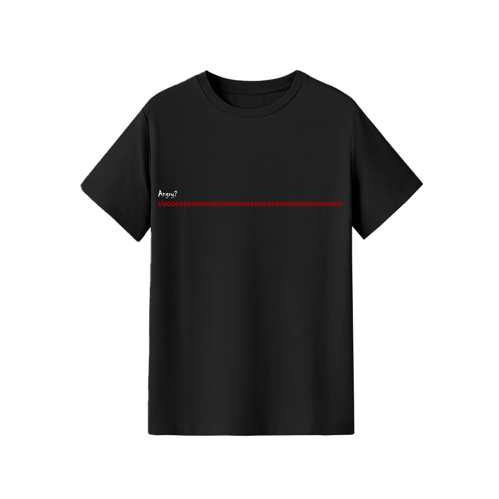 اما طرح جلوی تیشرت، با طنز خاص خود، این جدیت را خنثی میکند: "Angry? NOOOOOOOOO..." که با یک خط طولانی به رنگ قرمز یا سفید ادامه پیدا میکند و نشاندهنده تلاش برای پنهان کردن یک خشم شدید است. این طراحی خاص، این تیشرت را به یک انتخاب عالی برای کسانی تبدیل میکند که میخواهند با لباس خود یک داستان کوتاه و جذاب تعریف کنند.