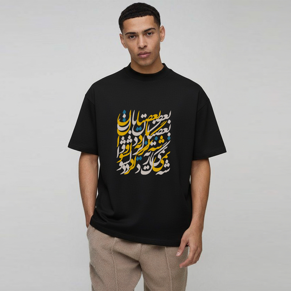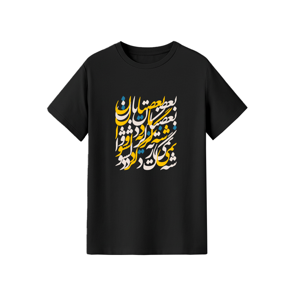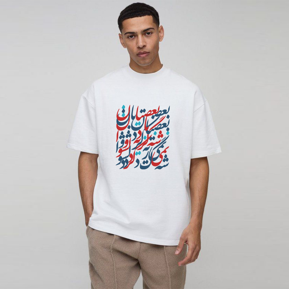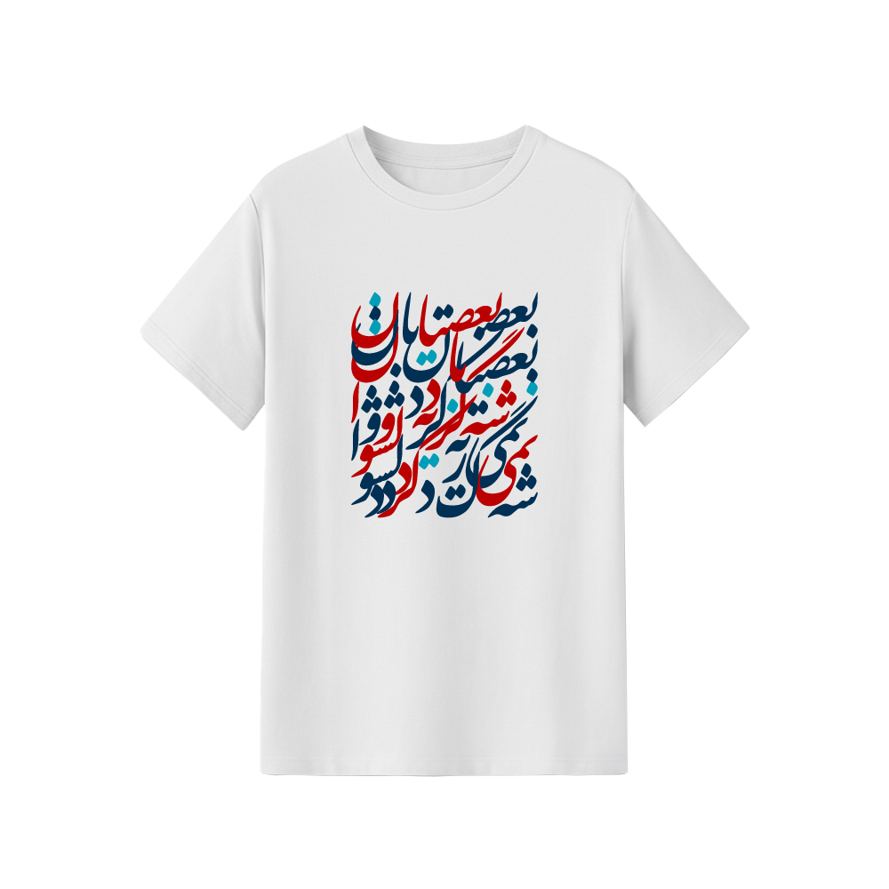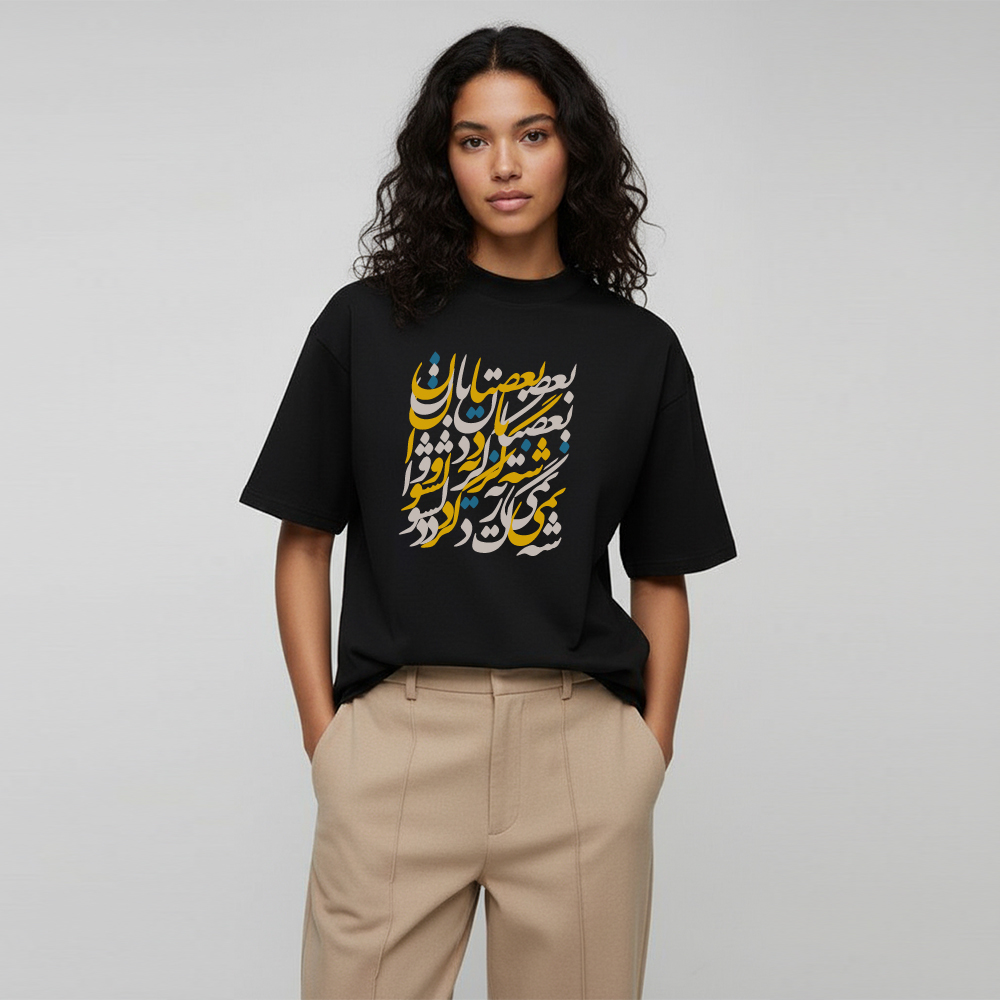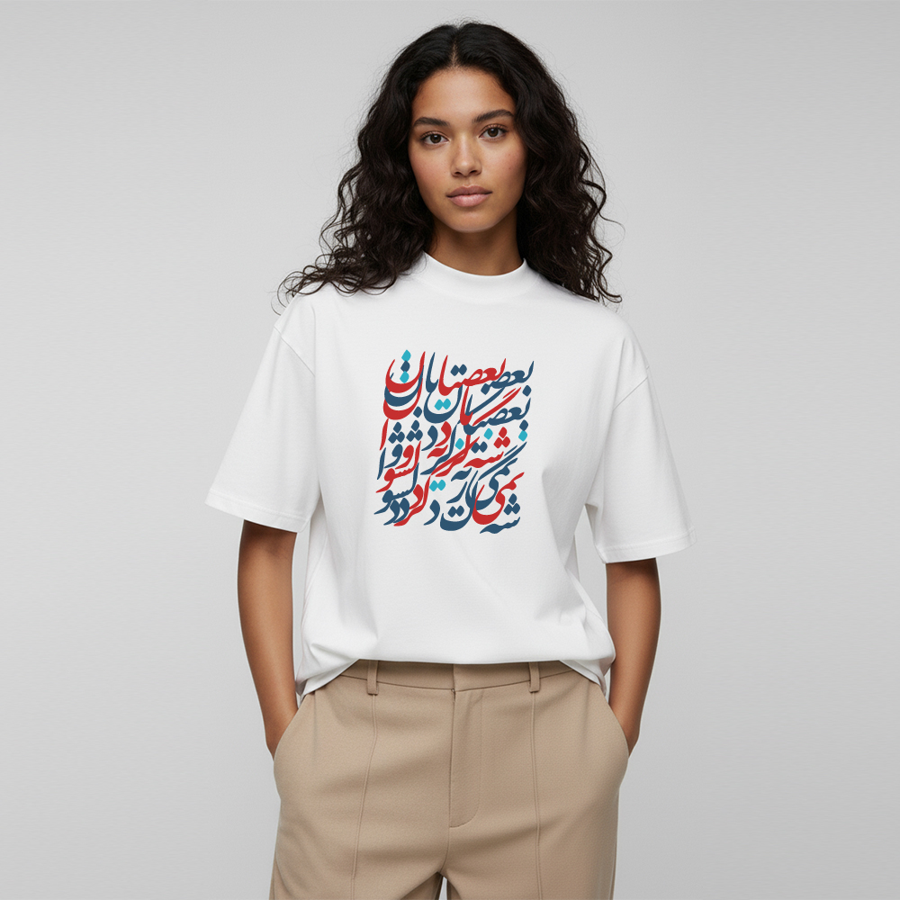 تیشرتی خاص و احساسی با طرح خوشنویسی مدرن و مفهومی از شعر معروف «بعضیا دلشون با گریه وا نمیشه». طراحی در قالب مربع و با خطوط نستعلیق ناخوانا، ترکیبی از هنر ایرانی و مینیمالیسم معاصر را خلق کرده است.این تیشرت در دو رنگ سفید و مشکی و از پارچه تمام پنبه باکیفیت بالا تولید شده و برای کسانی طراحی شده که به سادگی، معنا و هنر در پوشش اهمیت میدهند.