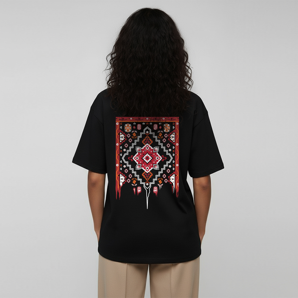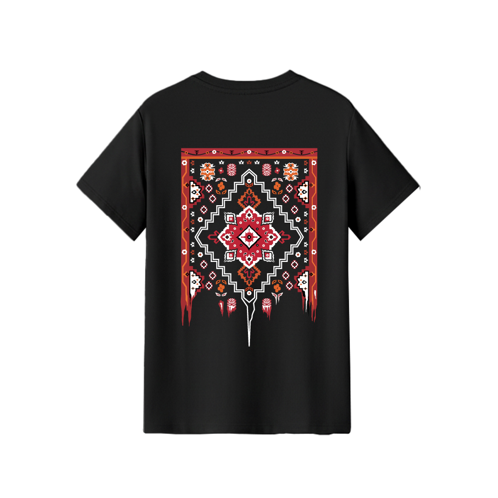 - رنگ تیشرت: مشکی عمیق و ثابت که تضاد زیبایی با رنگهای گرم طرح قالی ایجاد میکند.