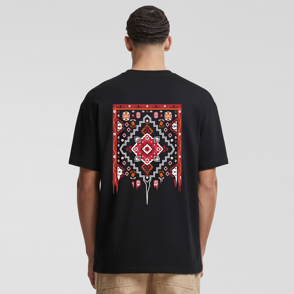 طرح روی این تیشرت، یک بازآفرینی هنری از نقوش مرکزی و حاشیهای قالیهای سنتی ایرانی، به ویژه سبکهای هندسی و گلیم است.