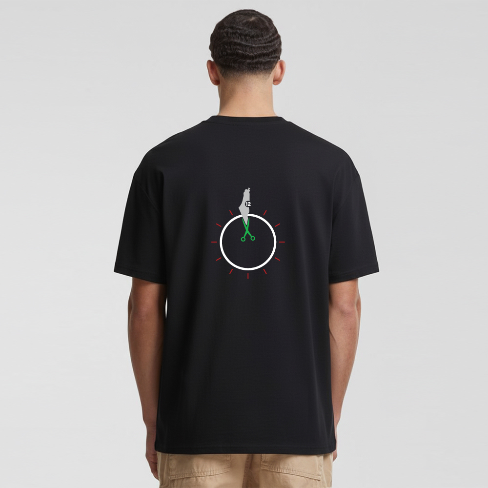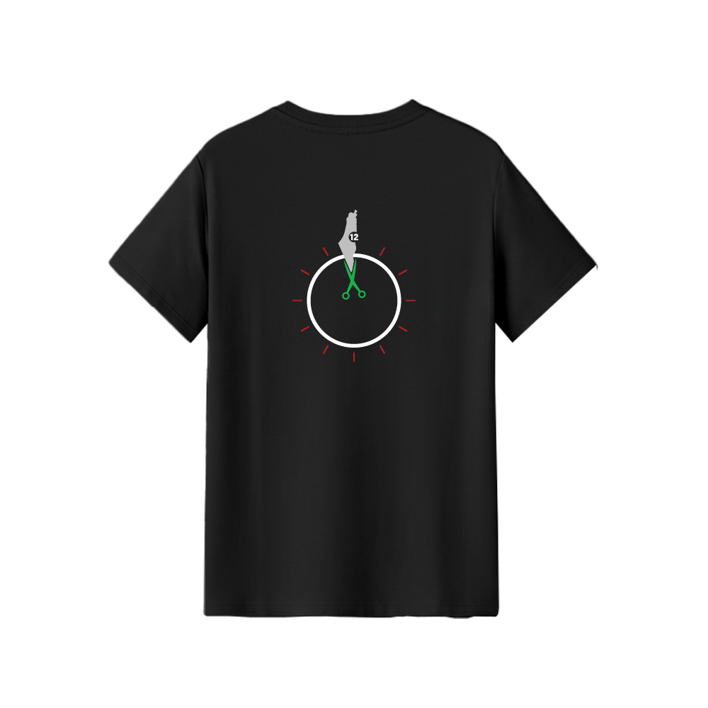 - طرح پشت: طرحی نمادین و معنادار است که در مرکز آن یک ساعت قرار دارد. نقشه منطقه جغرافیایی که میتواند نماد فلسطین/سوریه یا مناطق مقاومت باشد، در جای عقربه ساعت 12 قرار گرفته و قیچی سبزرنگی در مرکز، نمادی از «نقطه عطف تاریخ»، «پایان صبر» یا «برش در زمان» است. این طرح، عمق استراتژیک و اهمیت مسئله مقاومت در منطقه را به شکلی هنری نمایش میدهد.