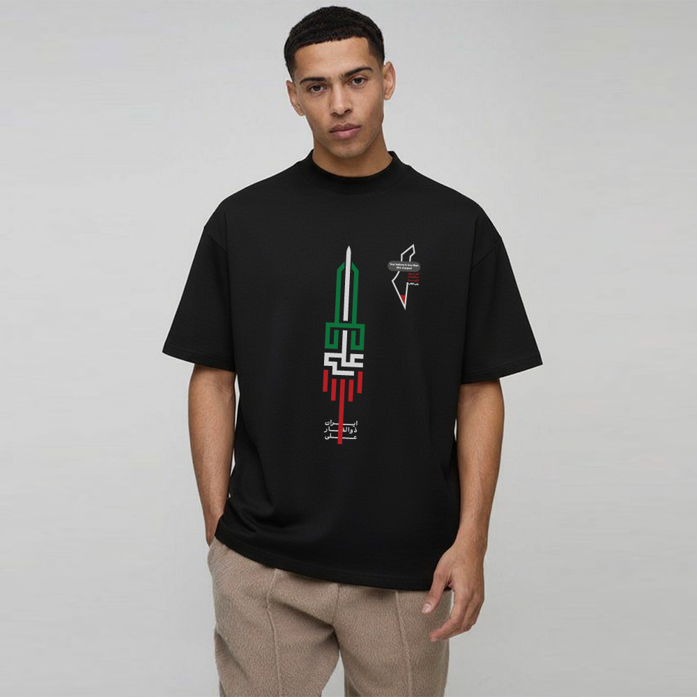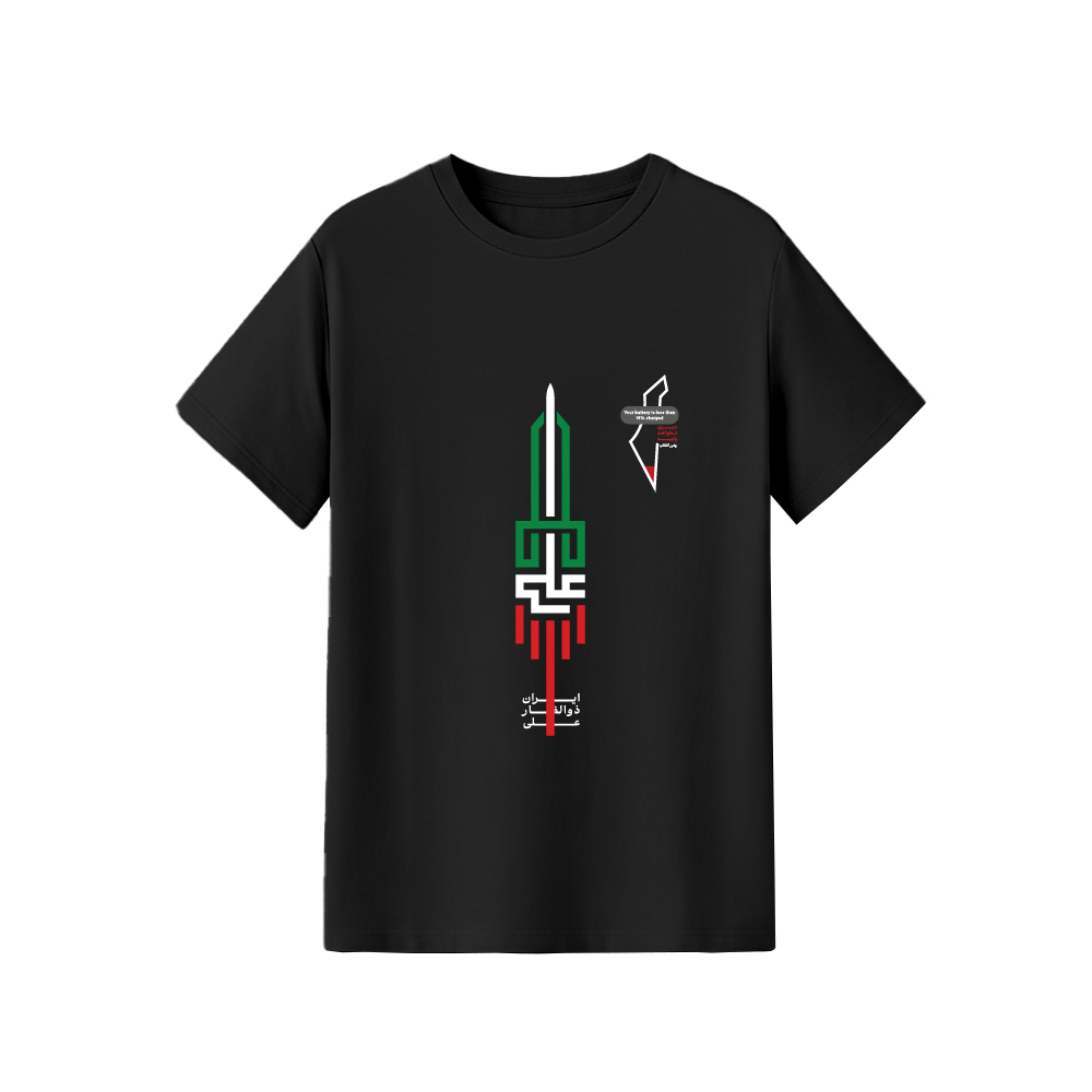 - طرح روی سینه (جلو): این طرح از خوشنویسی کوفی بنایی الهام گرفته شده است که یک سبک سنتی و قدرتمند در هنر اسلامی ایرانی است. نماد موشک یا شمشیری که از ترکیب حروف ایجاد شده، در کنار رنگهای پرچم ایران (سبز و قرمز)، به زیبایی مفهوم «قدرت، ولایت و عدالت حضرت علی (ع)» و «پایبندی به مقاومت» را به بیننده منتقل میکند.