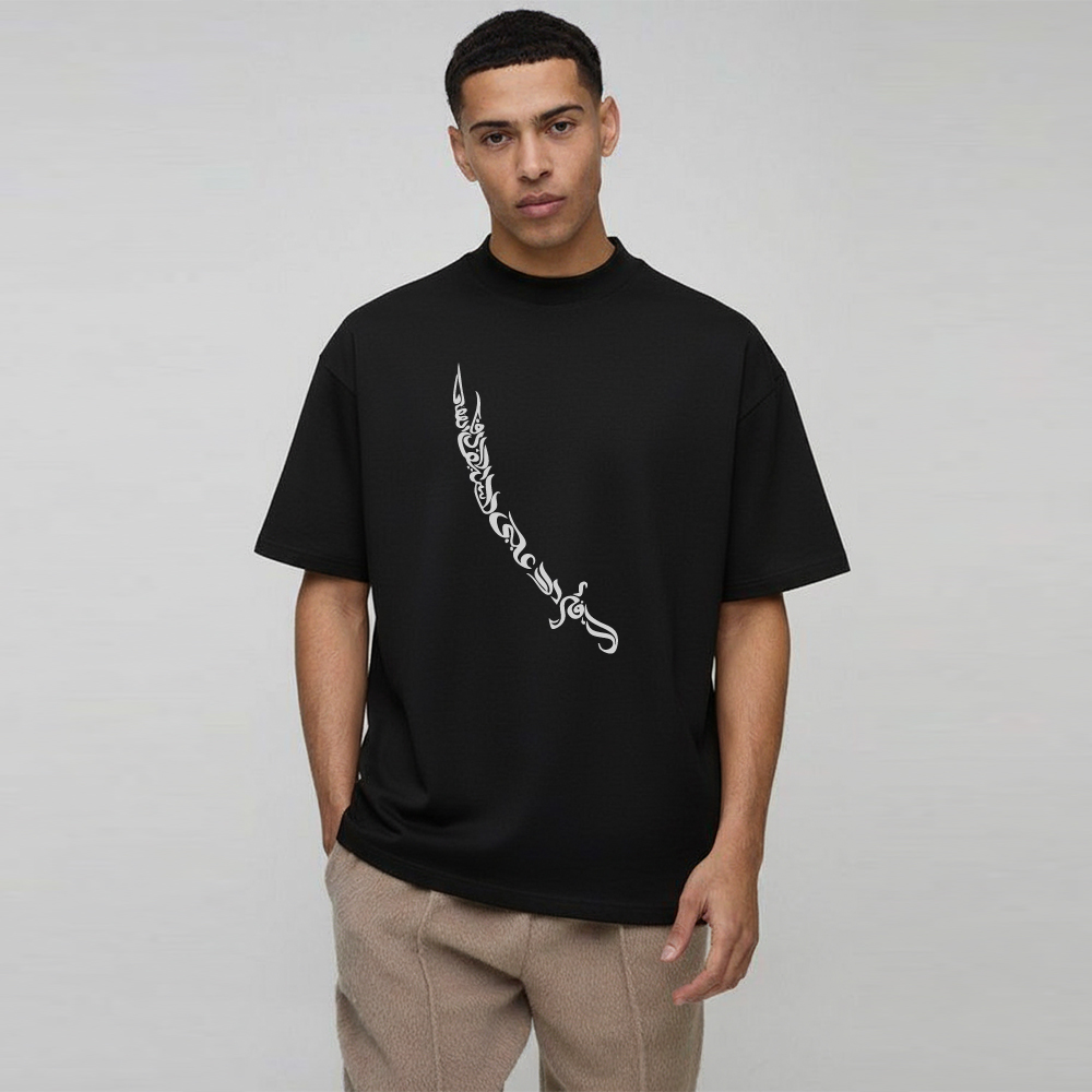 طرح اصلی این محصول یک نمونه درخشان از هنر تایپوگرافی مذهبی است. در این اثر هنری، خطوط عربی و فارسی به زیبایی در هم تنیده شدهاند تا شکل شماتیک شمشیر ذوالفقار، نماد عدالت و قدرت، را بازسازی کنند. ایده محوری، انتقال معنای عمیق عبارت "لا فتی الا علی لا سیف الا ذوالفقار" ("هیچ جوانمردی جز علی نیست و هیچ شمشیری جز ذوالفقار") در قالب بصری است. این سبک طراحی، نه تنها جنبه مذهبی و فرهنگی دارد، بلکه به دلیل زیبایی بصری و سبک خاص خود، برای علاقهمندان به هنر و طراحیهای مینیمال اما پرمحتوا نیز جذاب است. این تیشرت، ترکیبی از سنت و مدرنیته، و یک محصول خاص برای نمایش ارادت شماست.
